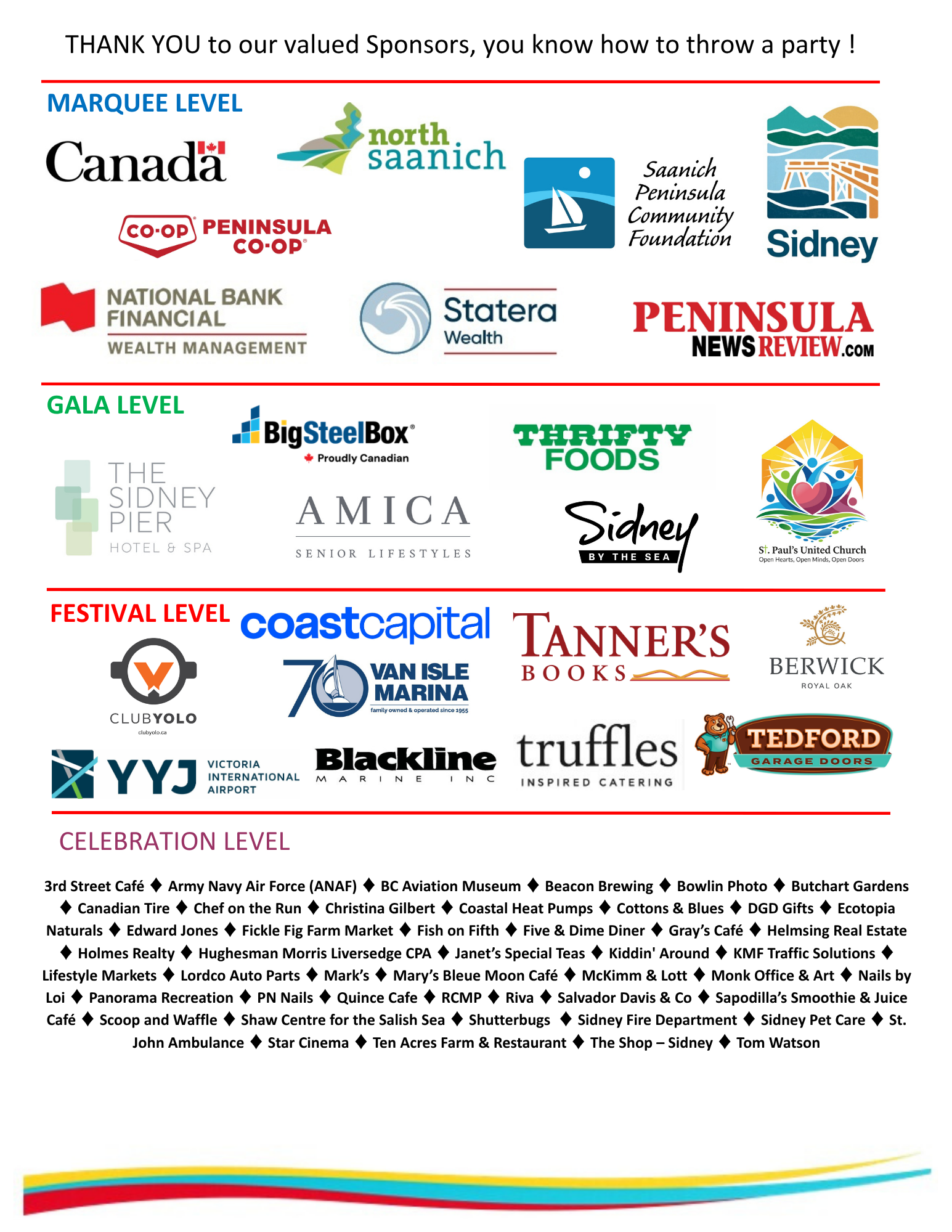 Through the generous donation of our local sponsors, Peninsula Celebrations Society is able to bring high-quality, family-focused events to the Saanich Peninsula, year after year.
